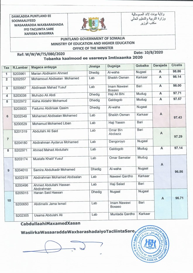 Isniin, Agoosto 10, 2020 (HOL) - Puntland ayaa maanta ku dhawaaqday natiijada imtixaanaadka shahaadiga ah ee sanad dugsiyeedka 2019/2020, waxaana markii ugu horeysay kaalinta koowaad ka galay gabadh.