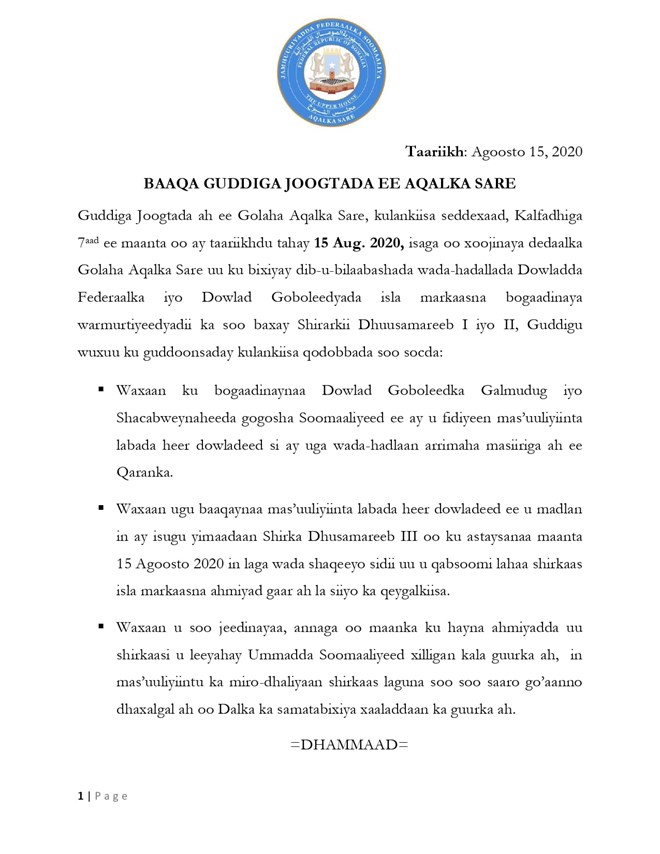 Sabti, Agoosto 15, 2020 (HOL) - Guddiga Joogtada ah ee golaha Aqalka Sare, ayaa kulan ay maanta ku yeesheen magaalada Muqdisho waxay baaq kagasoo saareen shirka loo madlanyahay ee Dhuusamareeb 3.