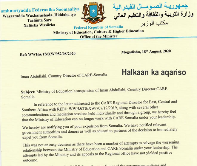 Qoraal kasoo baxay wasiirka waxbarashada ayaa sarkaalkaan lagu ogeysiiyay in dalka laga masaafurinayo, waxaana lagu yidhi sidatan,” Waxaan la socodsiinay mas'uuliyiinta dowladda, deeq bixiyeyaasha iyo sidoo kale la-hawlgalayaasheena waxbarashadda, go'aanka deg-dega ah oo aan kaaga saarayno Soomaaliya wakiilka hay'adda Care International.”