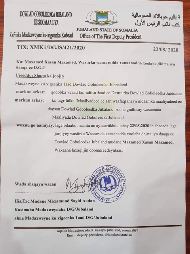 Sabti, Agoosto 22, 2020 (HOL) - Madaxweyne ku xigeenka Jubbaland Maxamuud sayid Aadan aya shaqadii ka joojiyay wasiirka wasaaradda xanaanada xoolaha dhirta iyo daaqa ee Jubbaland Maxamed Xasan Maxamed oo lagu eedeyay ku takrifal Maaliyadeed oo aan nidaamka maaliyadda Jubbaland waafaqsanayn.