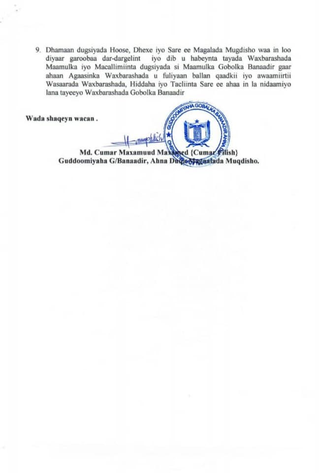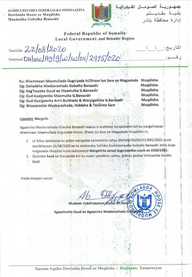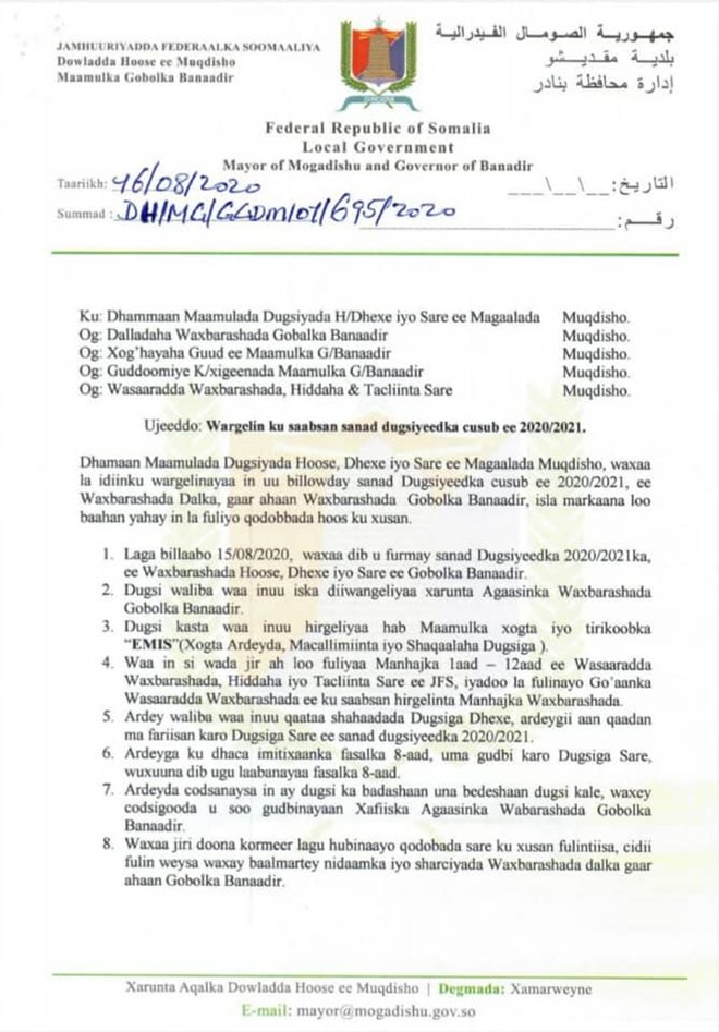 Isniin, Agoosto 24, 2020 (HOL) - War qoraal ah oo kasoo baxay agaasinka waxbarashada Gobolka Banaadir ayaa waxaa guud ahaan lagu amray in dugsiyada waxabarashada ee gaarka loo leeyahay ay iska soo diiwaan-geliyaan xaruntaas.
