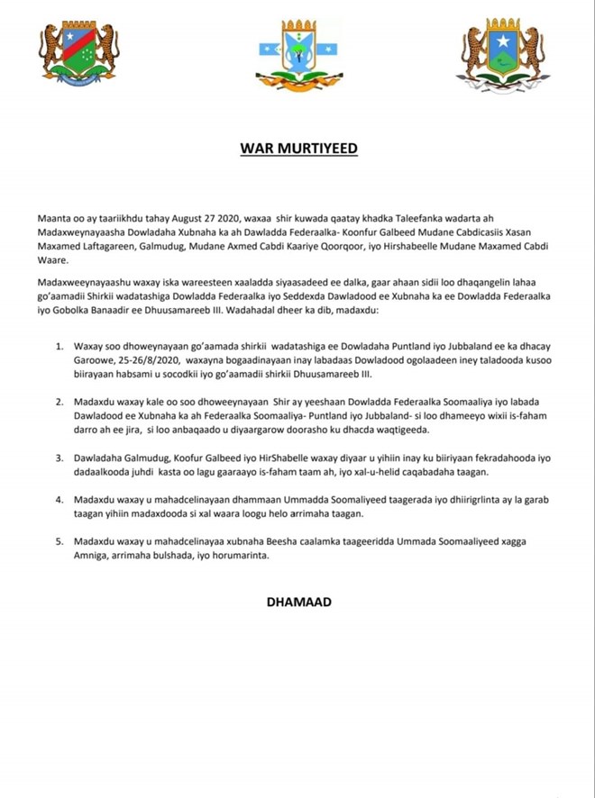 Khamiis, Agoosto 27, 2020 (HOL) - Kulan ay khadka taleefoonka ku yeesheen madaxweyneyaasha Dowlad goboleedyada Xubnaha ka ah DFS ee Galmudug ee Hirshabeelle iyo Koonfur Galbeed, ayaa waxay soo saareen War-Murtiyeed ay kusoo dhoweynayaan qodobadii kasoo baxay shirkii madaxweynayaasha Puntland iyo Jubbaland ku yeesheen Garowe.