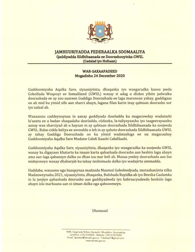 Khamiis, December, 24, 2020 (HOL) - Guddoomiyaha aqalka sare Cabdi Xaashi Cabdullaahi iyo siyaasiyiinta kasoo jeeda gobolada waqooyi ayaa kasoo horjeestay war kasoo baxay guddiga doorashada oo shaaciyay jadwalka doorashada aqalka sare.
