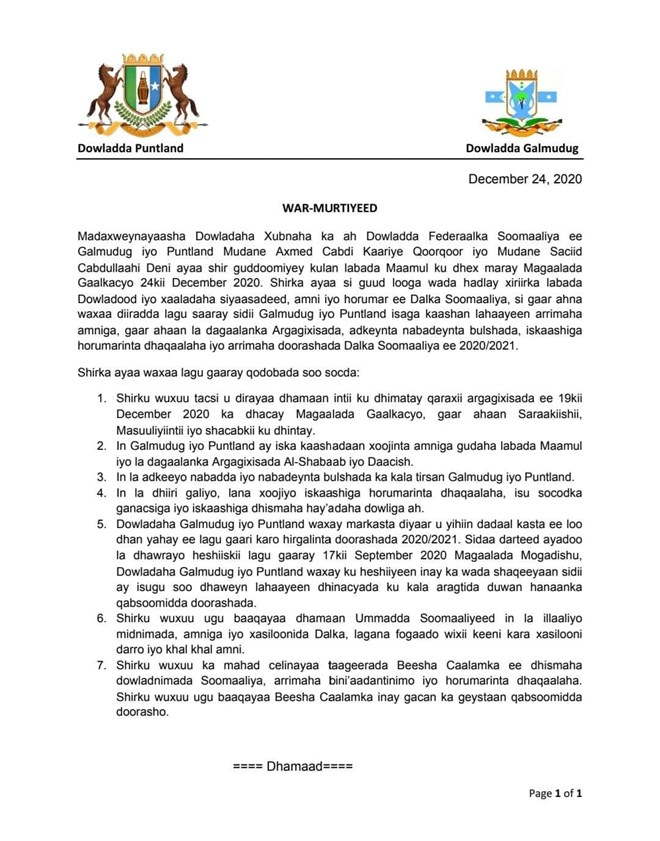 Khamiis, December, 24, 2020 (HOL) - War murtiyeed ayaa kasoo baxay shir maanta magaalada Gaalkacyo ku dhexmaray madaxweynayaasha dowlad goboleedyada Puntland iyo Galmudug, Siciid Deni iyo Axmed Qooroor.