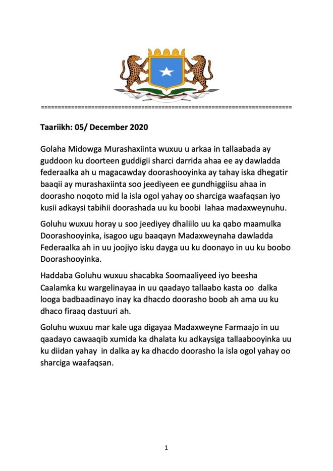 War Qoraal ah oo ka soo baxay ayeey sheegeen in tallaabada ay guddiga isaga soo dhax doorteen guddinka muujineyso sida leysaga dhaga-marinayo baaqyada is daba jooga ah ee ka soo baxay oo dalbanaya in gabi ahaanba la kala dirro guddiga.