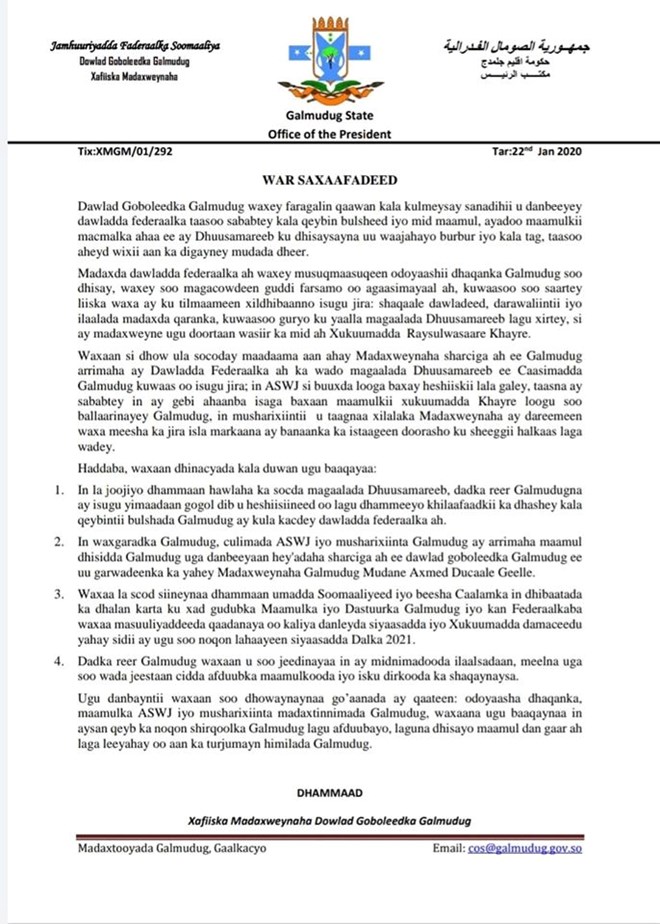 Khamiis, Janaayo, 23, 2020 (HOL)-Madaxweynaha Dowlad Gobolleedka Galmudug Axmed Ducaale Geelle Xaaf ayaa ku baaqay in la joojiyo sida uu hadalka u dhigay howlaha ka socda degmada Dhuusa-Mareeb ee Gobolka Galguduud.