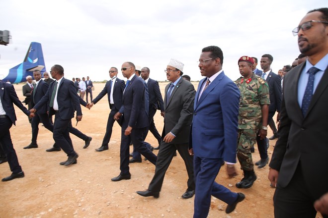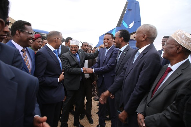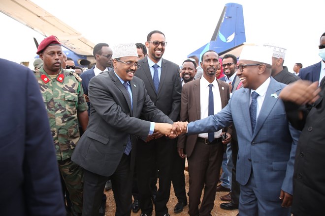 newsinsideMadaxweynaha iyo wafdigiisa waxaa garoonka diyaaradaha Magaalada Dhuusamareeb ee Ugaas Nuur ku soo dhaweeyay Ra’iisul Wasaaraha Xukuumadda Soomaaliya Xasan Cali Khayre iyo madaxweynayaasha dowlad goboleedyada ee ku sugan Dhuusomareeb.
