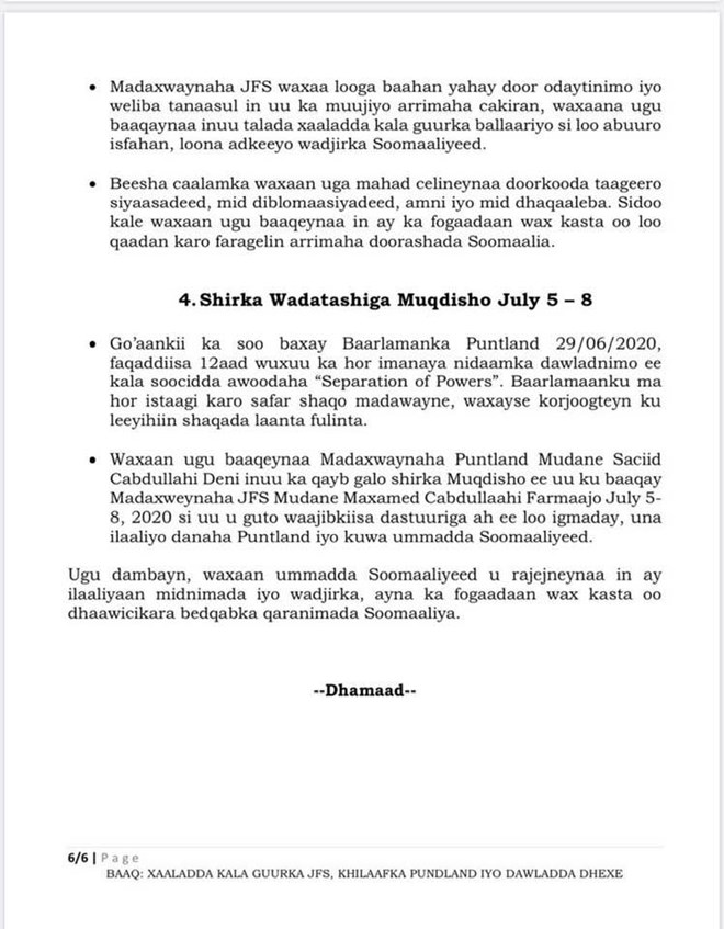 Jimco, July 3, 2020 (HOL) - Siyaasiyiin kasoo jeeda Puntland oo xilal kala duwan kasoo qabtay dowladda federalka iyo maamulka Puntland iyo Senataro ayaa madaxweyne Deni ugu baaqay inuu ka qeyb galo shirka wadatashiga doorashada ee Muqdisho ka dhacayo.