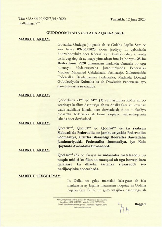 Jimco, Juun 12, 2020 (HOL) - Guddoomiyaha aqalka sare ee Soomaaliya ayaa magacaabay guddi ka kooban sagaal xubnood oo ka shaqeyndoona sidii ay iskugu keeni lahaayeen madaxda dowladda federalka iyo dowladdaha xubnaha ka ah.