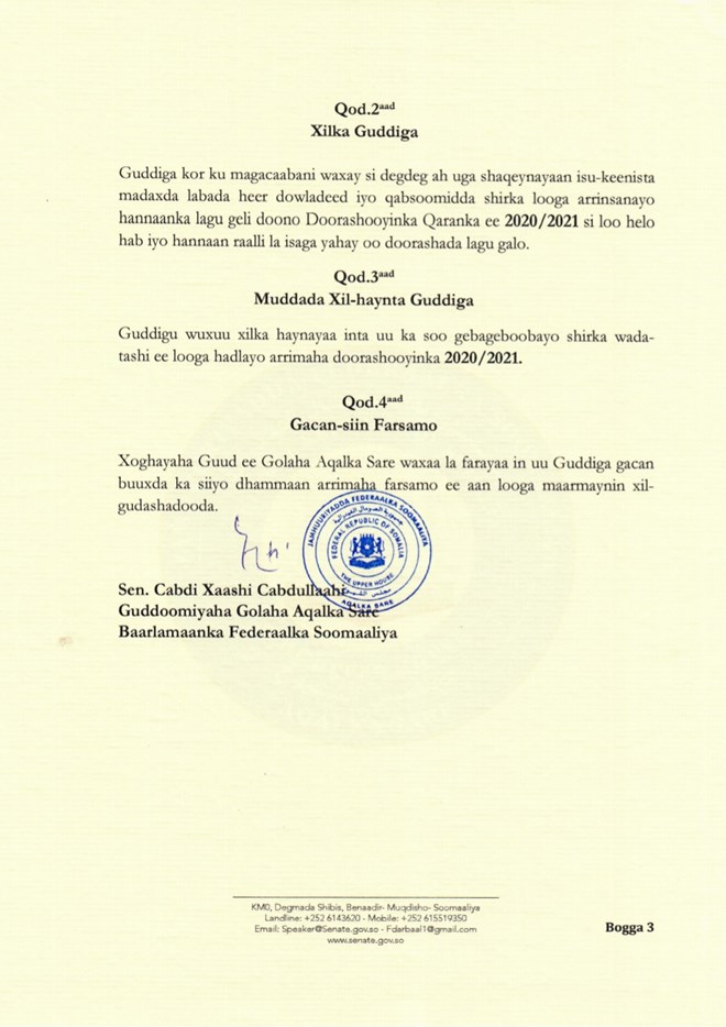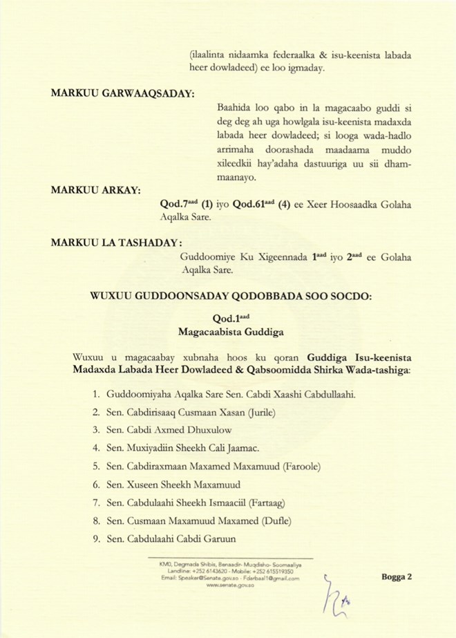newsinsideGuddoomiyaha wuxuu sheegay isagoo xeerinaya awoodaha dastuuriga ee aqalka sare uu leeyahay, inuu guddigaan u magacaabay sidii loo dhameyn lahaa khilaafka siyaasadeed ee taagan, kahor inta uusan dhammaan muddo xilleedka hay’addaha dastuuriga ee uu kamidka yahay.