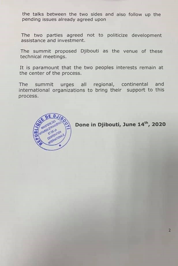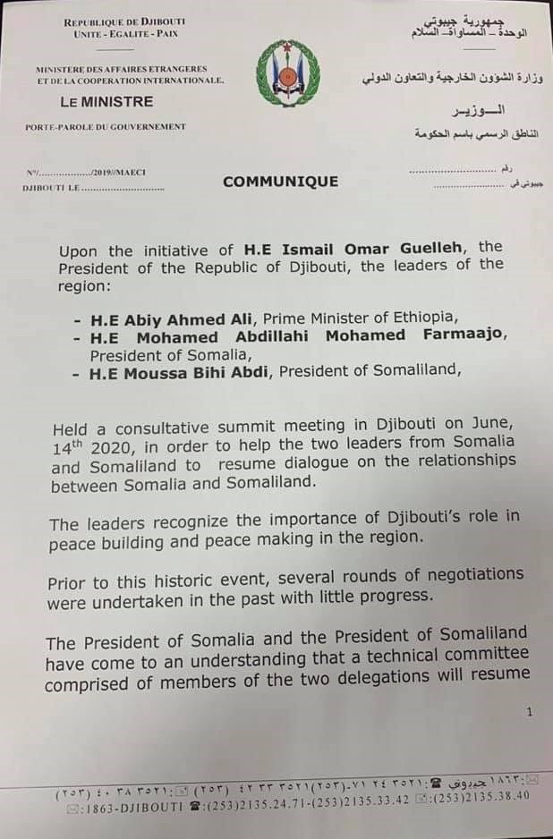Axad, Juun 14, 2020 (HOL) - War murtiyeed kooban ayaa kasoo baxay kulankii hoggaamiyayaasha dowladda federalka Soomaaliya iyo Somaliland ay ku lahaayeen dalka Jabuuti.