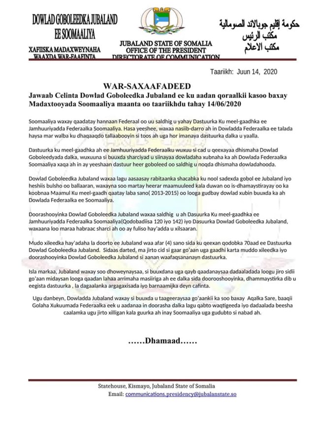 Axad, Juun 14, 2020 (HOL) - Jubbaland ayaa jawaab ka bixisay qoraal maanta kasoo baxay madaxtooyada Soomaaliya, oo lagu sheegay in ay dowladdu ogolaatay in madaxweyne Axmed Madoobe muddo labo sano ah uu xilka madaxweynaha Jubbaland si kumeel gaar ah usii hayo, kadibna uu qabto doorasho.