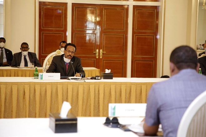 Madaxweyne Maxamed Cabdullaahi Farmaajo oo ay garbaha ka fadhiyaan Guddoomiyaha Golaha Shacabka Baarlamanka FS Mudane Maxamed Mursal Sheekh, Raiisul Wasaaraha XFS Mudane Xasan Cali Khayre, Wasiirro iyo masuuliyiin kale oo heer Qaran ah ayaa la wadaagay Madaxdii kulanka ka soo qeyb gashay iyo beesha caalamka sida Dowladda Federaalka Soomaaliya ay uga go’an tahay in wadahadal maan furan oo miro dhal ah lagu xalliyo tabashada walaalaheenna Soomaaliland.