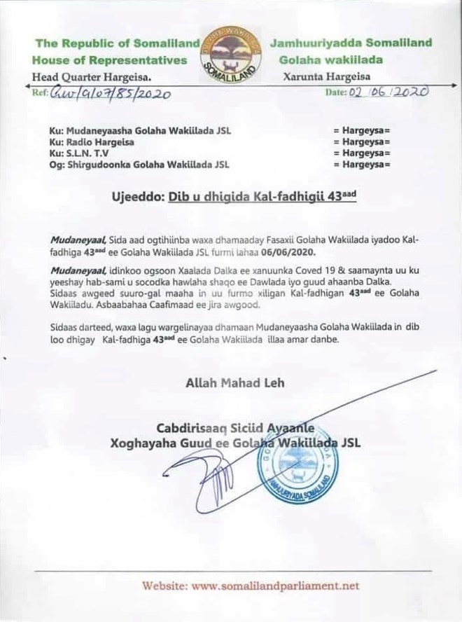 newsinsideWar qoraal ah oo kasoo baxay xafiiska xoghayaha guud ee Baarlamanka ayaa lagu sheegay in sababa la xariira xaaladda ay Somaliland mareyso iyo saameynta habsami u socodkii shaqada dowladda uu ku yeeshay COVID-19 darteed dib loo dhigay kalfadhigii furmi lahaa.
