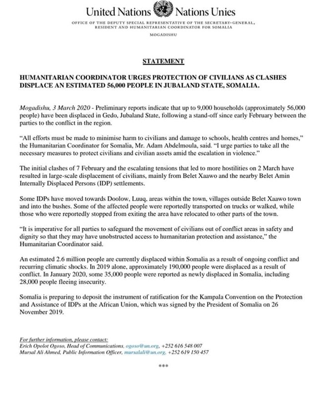 Talaado, Maarso, 03, 2020 (HOL)-Warar hor dhac ayaa sheegaya in ilaa 9,000 oo qoys (56,000 oo qof)ku barakaceen colaadaha ka soo cusboonaaday gobolka Gedo ee Dowlad Goboleedka Jubaland laga soo bilaabo horaantii bishii Febraayo ee sannadkan.