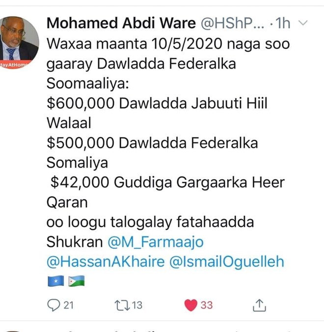 newsinsideMadaxweynaha ayaa sheegay inaay heleen lacag gaareeysa $1,142000 (Hal milyan, boqol afartan iyo laba kun oo doolar) oo ka soo gaartay dowlada Soomaaliya, wuxuuna sheegay in lacagtaas $600,000 oo ka timid dalka Jabuuti, $500,000 aay ka timid dowlada federaalka, halka $42,000 ay ka soo gaartay gaartay Gudiga Gargaarka Qaranka. Sida uu Madaxweyne Waare ku sheegay bogiisa Twitterka.