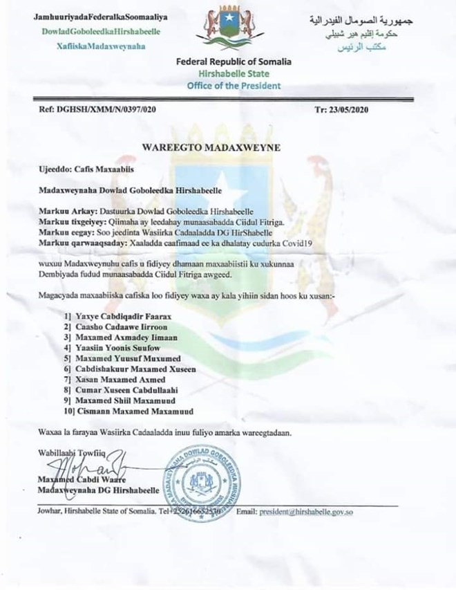 Sabti, May 23, 2020 (HOL) - Madaxweynaha maamulka Hirshabeelle Maxamed Cabdi Waare oo ku sugan magaalada Beledweyne ayaa cafis u fidiyay maxaabiis kujira xabsiyada Hirshabeelle.