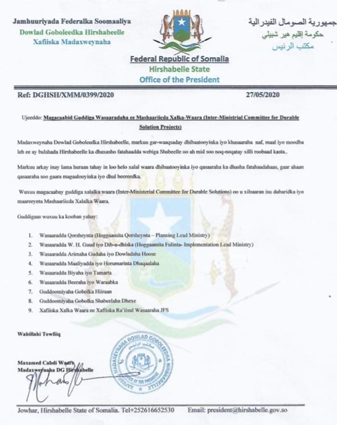 Khamiis, May 28, 2020 (HOL) - Madaxweynaha Hirshabeelle Maxamed Cabdi Waare ayaa magacaabay gudiga maareeynta mashaariicda xalalka waara ee laga gaarayo fatahaada wabiga Shabeelle.