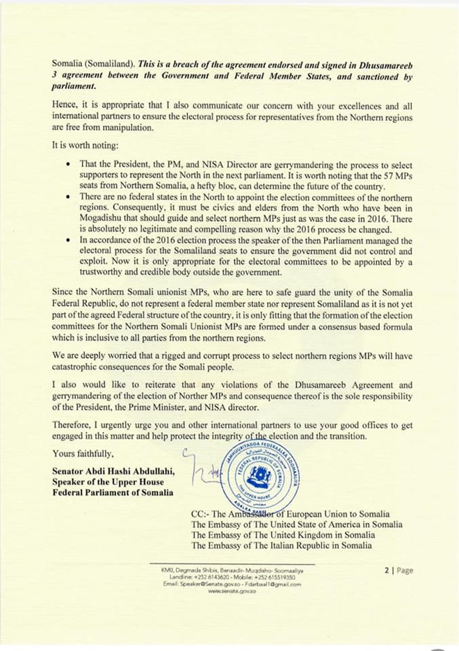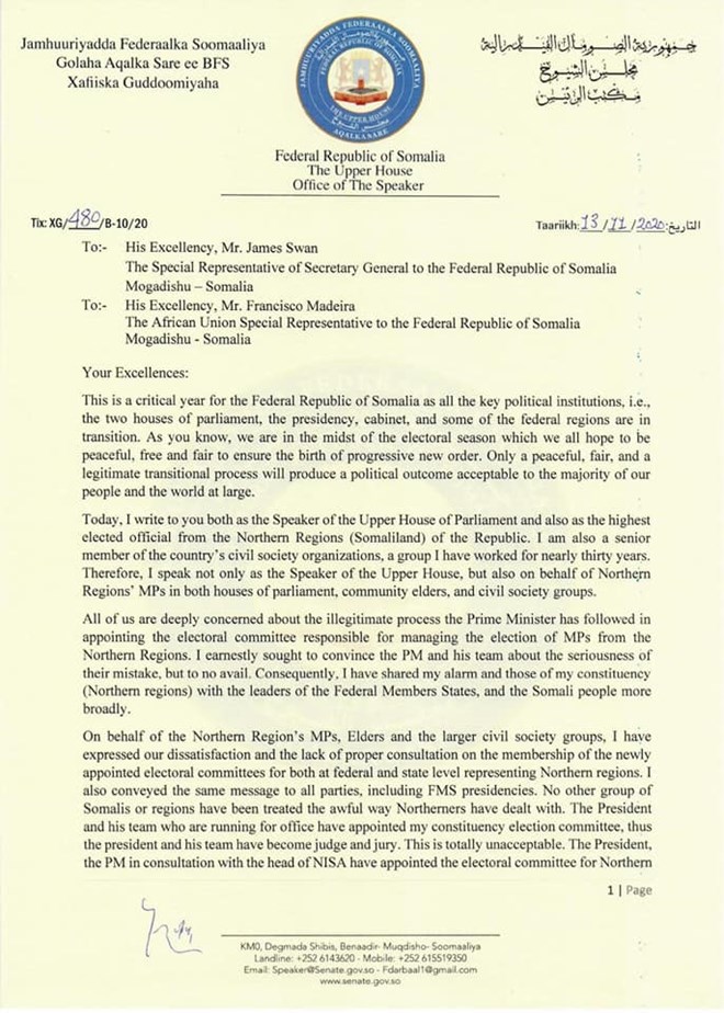 Axad, November, 15, 2020 (HOL) -Guddoomiyaha Golaha Aqalka Sare ee Soomaaliya Cabdi Xaashi Cabdillaahi ayaa Qoraal ka dhan ah Guddiyada Doorashooyinka u diray beesha caalamka gaar ahaan Wakiilka QM eeArrimaha Soomaaliya Amb, James Swan, Wakiilka Midowga Afrika ee Somalia Amb, Francisco Madera.