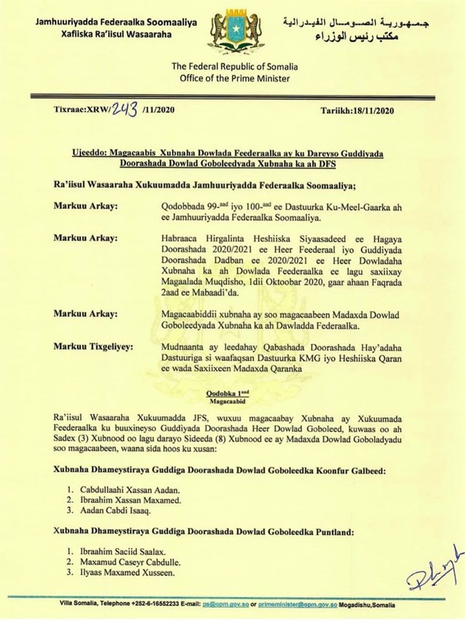 Arbaco, November, 18, 2020 (HOL) - Raysal wasaaraha dowladdda federalka Soomaaliya ayaa wareegto ku magacaabay xubno lagu dhameytirayo guddiyada doorashooyinka heer dowlad goboleed, iyadoo laga ambaqaadayo heshiiskii siyaasadeed ee arrimaha doorashada.