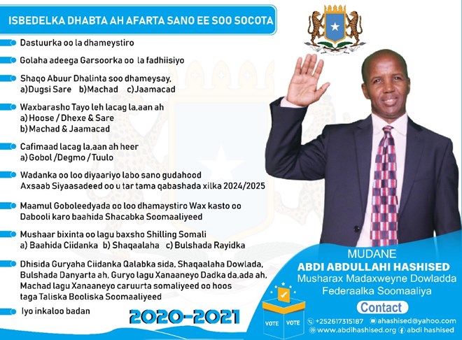 Musharax Cabdi Cabdulaahi Xaashi, ayaa ballanqaaday haddii la doorto afarta sano ee soo socota inuu ka shaqeyndoono dhameystirka dastuurka, shaqo abuurka dhalinyarada Soomaaliyeed, waxbarasho iyo caafimaad lacag la’aan ah iyo sidoo kale in muddo labo sano gudaheed ah uu dalka gaarsiindoono doorashado axsaabta badan.