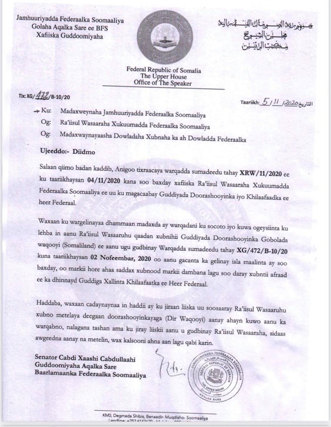 Hoos ka akhriso Qoraalka ka soo baxay Guddoomiyaha Aqalka Sare