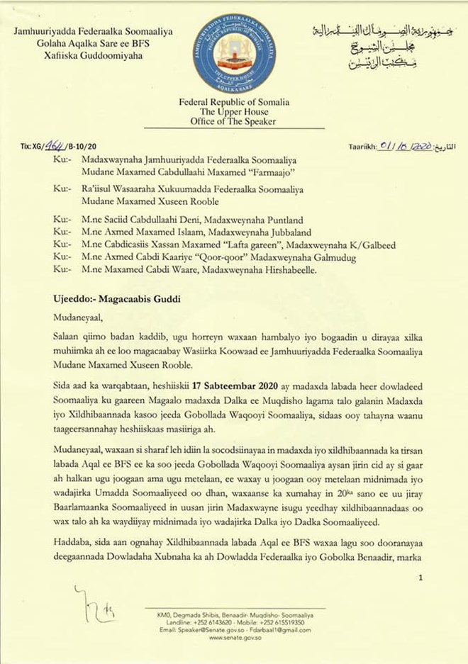 Khamiis, October 1, 2020 (HOL) - Golaha Aqalka sare ee dalka ayaa Magacaabay Guddi qaban qaabada doorashada xildhibaanada labada aqal ee kasoo jeeda gobolada waqooyi ee Somaliland, maadaama ay doorashadadoodu ka dhacayso Muqdisho.