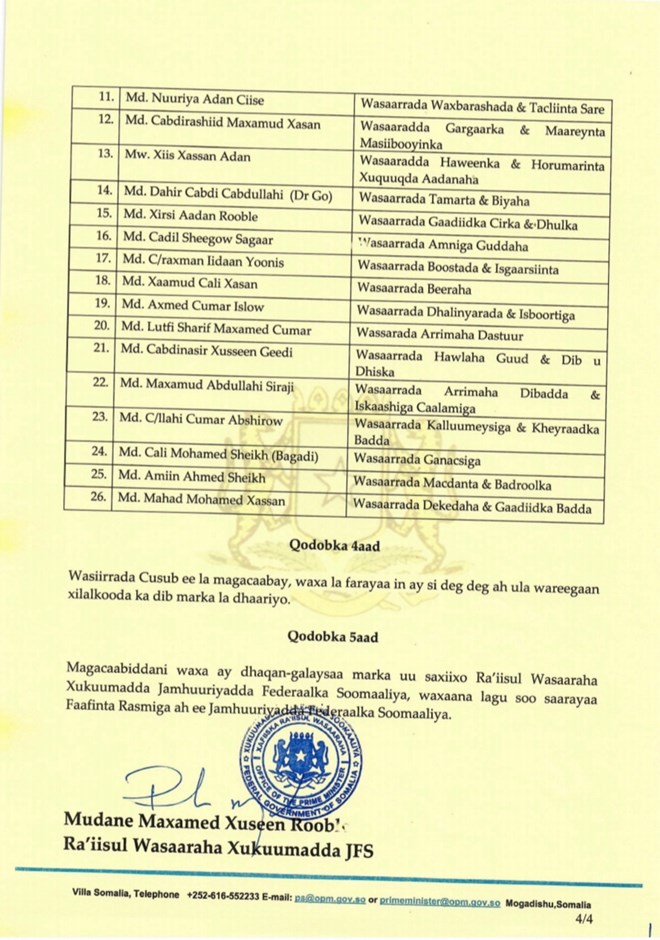Isniin, October 19, 2020 (HOL) - Raysal wasaaraha Soomaaliya Maxamed Xuseen Rooble ayaa caawa magacaabay golaha wasiiradda xukuumada Soomaaliya, kuwaas oo intooda badan ah wasiiradda xukuumadii hore Ee Kheyre.
