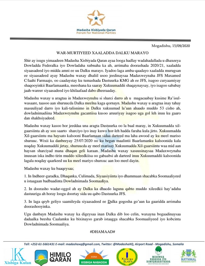 Talaado, 15 September, 2020 (HOL) -Madasha Xisbiyada Qaran ee ay hogaamiyaan madaxdii hore ee dowladda federaalka Soomaaliya ayaa soo saaray eedeyn ay ujeediyeen madaxweyne Maxamed Cabdullaahi Farmaajo.