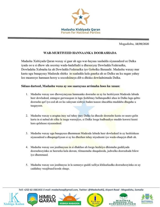 Jimco, September 18, 2020 (HOL) - Madasha xisbsiyada siyaasadeed ee Soomaaliya ayaa soo dhoweeyay natiijadii kasoo baxday wada hadalkii dowladda federalka iyo dowlad goboleedyada, kaasoo ugu dambayn heshiis looga gaaray hannaanka doorashada soo socota.