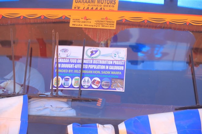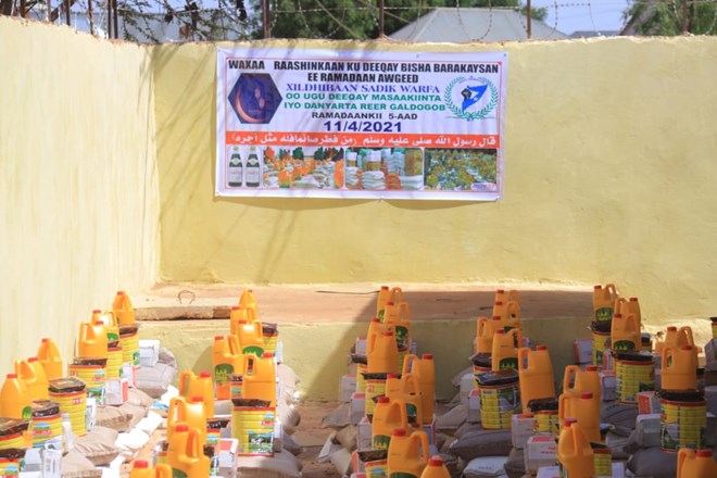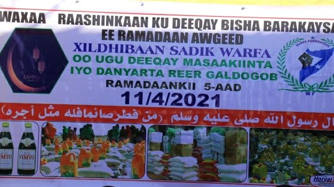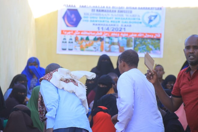 Axad, April, 11, 2021 (HOL) - Xafiiska U-Adeega Bulshada ee Xildhibaan Sadiq Xirsi Warfa ee ku yaala degmada Galdogob ayaa maanta u qaybiyay raashin loogu talagalay afurka bisha Ramadaan iyo biyo dhaamin Boqol iyo toban qoys oo kamid ah dadka danyarta ah ee ku dhaqan degmada Galdogob ee gobolka Mudug.