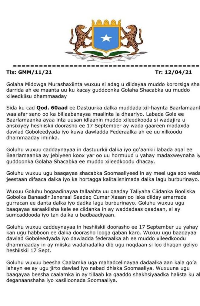 Talaado, April, 13, 2021 (HOL) - Qoraal ka soo baxay midowga Musharixiinta ayaa lagu qaadacay muddo korarsigii labada Sano ee Golaha Shacabku u sameeyay maalintii shalay dowladda hadda jirta, iyaga oo ku tilmaamay labo sano oo loo diyaargaroobayo doorasho qof iyo cod ah.