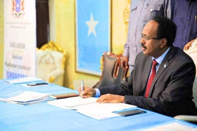 Arbaco, April, 14, 2021 (HOL) - Madaxweynaha Soomaaliya Maxamed Cabdullaahi Farmaajo ayaa xalay meel mariyay sharciga gaarka ah ee Jihaynta doorashooyinka heer federaal ee Baarlamaanku meel mariyay.