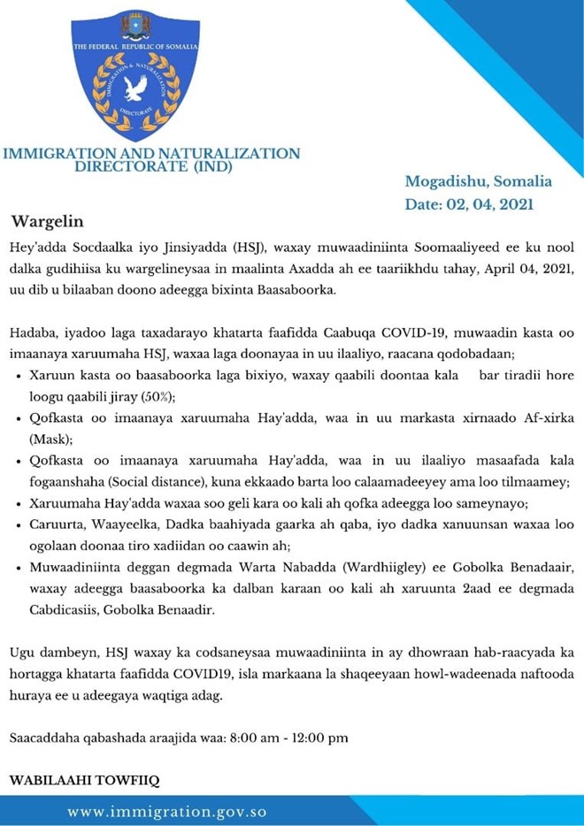 newsinsideWar kasoo baxay Hay'adda Socdaalka iyo Jinsiyadda Soomaaliya lagu sheegay in maalinta Axadda ah ee tariikhdu tahay 4 abriil uu dib u bilaaban doono adeegga bixinta Baasaboorka Soomaaliga ah, iyada oo la ilaalinaayo tallaabooyinka looga hortagaayo faafista cudurka COVID-19.