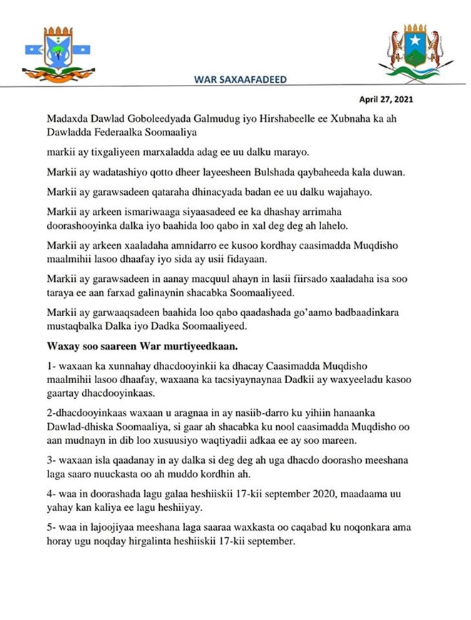 Talaado, April, 27, 2021 (HOL) - Dowlad goboleedyada Galmudug iyo Hirshabelle ayaa isku raacay in si degdeg ah loo qabto doorashooyinka Soomaaliya si meesha looga saaro xaaladda karin ee ka dhalatay muddo kordhintii uu barlamaanka sameeyay.