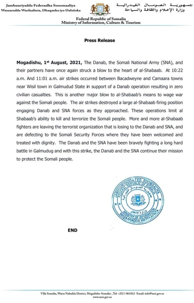 Axad, Agoosto, 1, 2021 (HOL) - War-saxaafadeed maanta oo Axad ah kasoo baxay wasaaradda warfaafinta Soomaaliya ayaa lagu sheegay in dowladda Soomaaliya iyo la-hawlgalayaasheeda ay habeenimadii xalay weerar cirka ah la beegsadeen Al-Shabab meel u dhow magaalada Wasil ee gobolka Mudug.