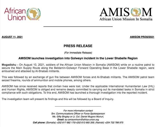 Khamiis, Agoosto, 12, 2021 (HOL) - AMISOM ayaa sheegtay inay bilowday baaritaan ku aadan dhacdadii tuulada Golweyn ee gobolka Shabeelaha hoose, kaddib markii lagu eedeeyay askartooda in ay si bareer ah u laayeen dad shacab ah oo aan waxba galafsan.