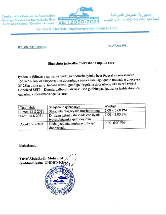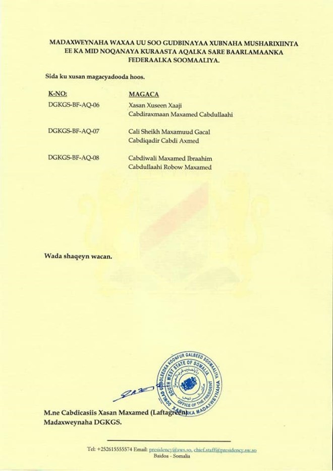 Sabti, Agoosto, 14, 2021 (HOL) - Madaxweynaha maamulka Koonfur Galbeed Cabdicasiis Xasan Maxamed Laftagareen ayaa soo saaray liiska xubnahii ka dhinaa doorashada kuraasta Aqalka sare ee deegaan doorashadooda tahay Koonfur Galbeed Soomaaliya.