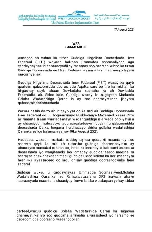 newsinsideWar qoraal ah oo aay soo saareen xubno ka tirsan guddiga doorashada heer Fedaraal ayaa lagu sheegay inaan la isku raacsaneen habraacii shalay soo baxay ayna ku koobneyd qeyb ka mid ah guddiga, islamarkaana ay sheegeen in habraacyada la shaaciyay aysan aheyn kuwa saxan.