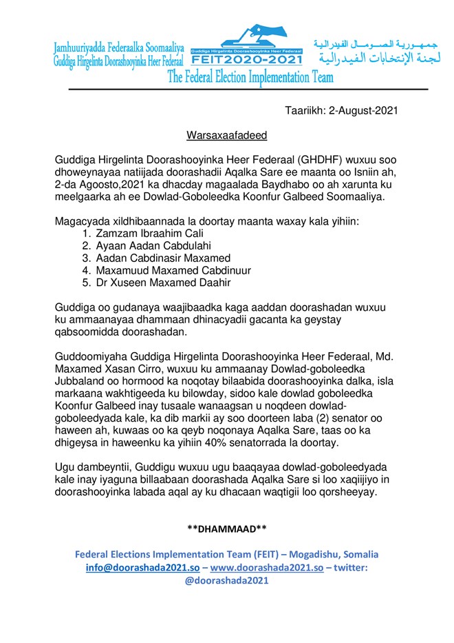 Hoos ka akhriso War saxafadeedka kasoo baxay guddiga doorashooyinka heer Fedaraal:-