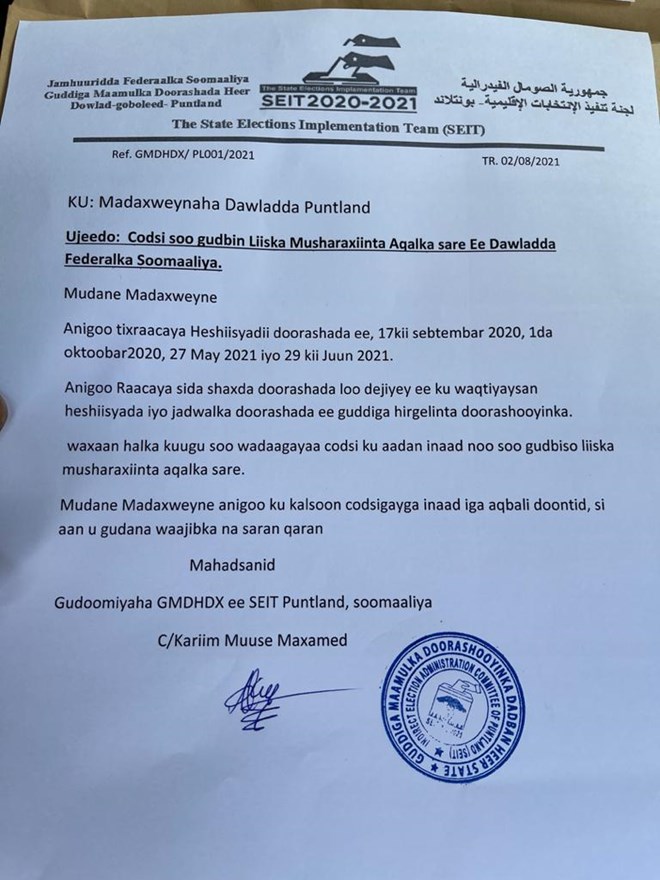 Talaado, Agoosto, 3, 2021 (HOL) - Guddiga hirgalinta Doorashooyinka heer dowlad goboleedka ee Puntland ayaa warqad codsi ah u gudbiyay madaxweynaha maamulka Puntland Siciid Cabdullaahi Deni.