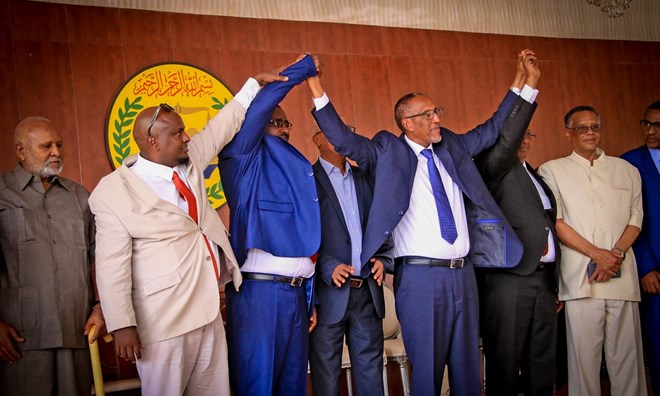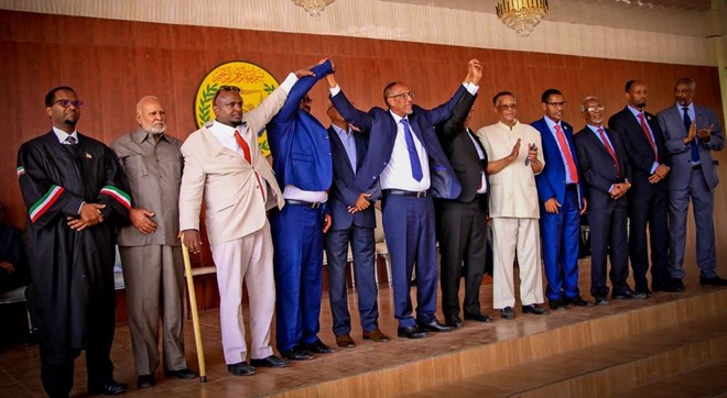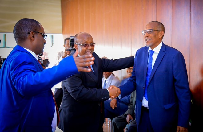 Talaado, Agoosto, 3, 2021 (HOL) - Madaxweynaha Somaliland Muuse Biixi Cabdi ayaa kulan hambalyo ah la qaatay Cabdirisaaq Khaliif Axmed oo loo doortay guddoomiyaha golaha wakiilada cusub ee Somaliland, iyo Siciid Mirre Faarax iyo Cali Xaamud Jibriil, oo ku kala guulaystay jagooyinka guddoomiye ku xigeenka 1aad iyo 2aad ee golaha wakiilada.