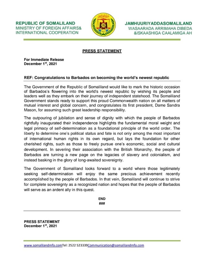 newsinside"Dowlada J. Somaliland waxay jeceshahay in ay xusto munaasibada taariikhiga ah ee ah in Barbados noqotay qaran cusub oo caalamka kusoo biiray, waxayna ugu hambalyaynaysa madaxda iyo dadka dalkaas, in ay gaadheen qaranimo" ayaa lagu yidhi qoraalka.