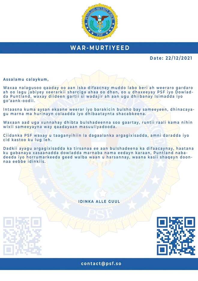 PSF waxay sheegtay in ay dagaal kula jiraan dad argigixisada ka tirsan oo ku gabanaya xasaanad dowladdeed. Waxay kaloo sheegeen in ay mar walba u taagan yihiin difaaca nabadda Puntland iyo la dagaalanka argigixisada.