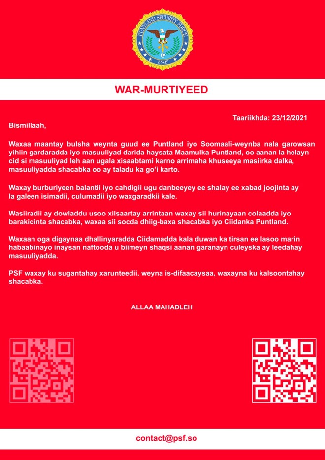 “Si loo dhiirigeliyo sidii xal nabadeed loogu dhammeyn lahaa xaaladda xil wareejinta masuuliyadda iyo hantida PSF, Dowladda Puntland waxay ku celinaysaa in ay wakhti siinayso dadaalada loogu jiro in si nabad ah lagu dhammeeyo xaaladda Boosaaso,” ayaa lagu yiri warka madaxtooyada.”
