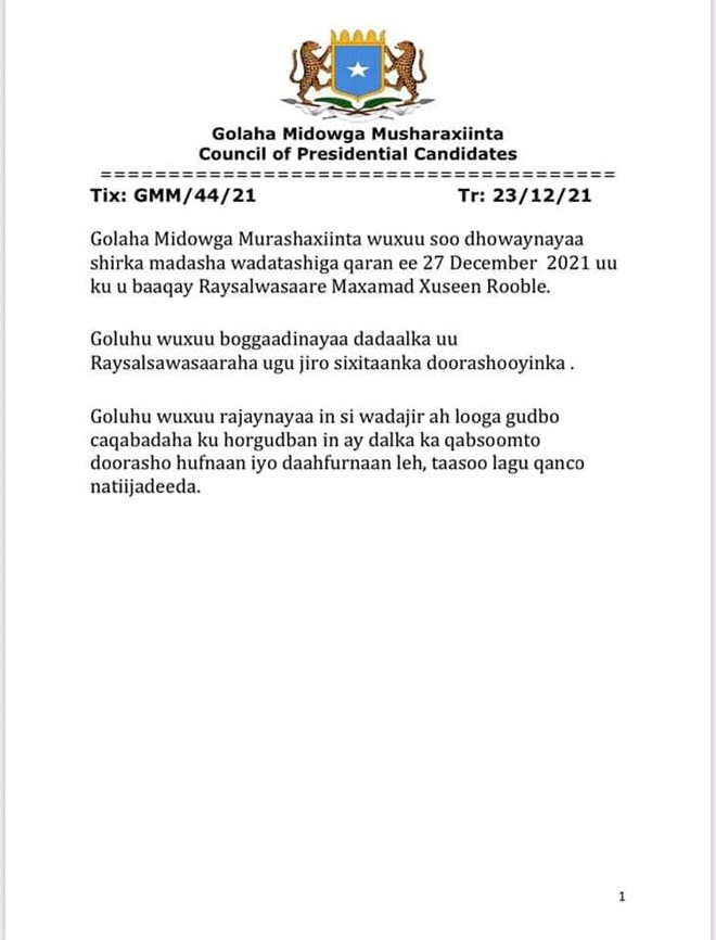 Dhinaca kale Midowga Musharaxiinta madaxweynaha Soomaaliya ayaa dhankooda sheegay iney soo dhaweynayaan shirka Golaha wadatashiga Qaran ee dhawaan ku dhex mari doona magaalada Muqdisho.