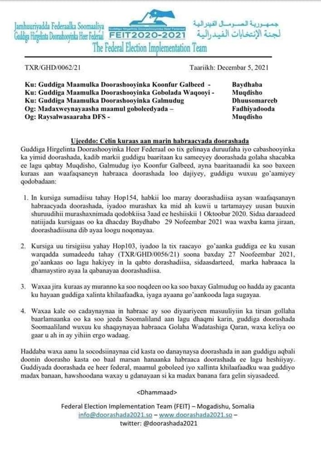 Axad, December, 5, 2021 (HOL) - Guddiga heer federal ee doorashooyinka Soomaaliya ayaa qoraal ay soo saareen waxay ku sheegeen in dib loogu laabanayo doorashada labo kursi oo dhawaan lagu doortay magaalada Baydbabo.