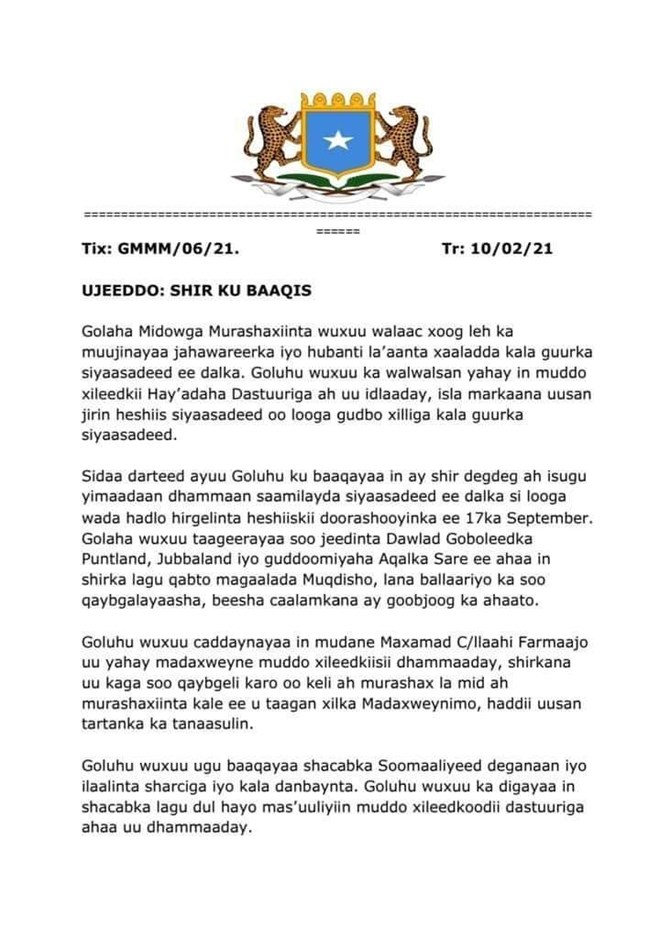 Arbaco, Feberaayo, 10, 2021 (HOL) - Qoraal ka soo baxay Midowga Musharixiinta ayaa lagu taageerray baaqii Dowlad gobolleedyada Puntland, Jubbaland iyo Guddoomiyaha Aqalka sare oo isku raacay in magaalada Muqdisho lagu qabto shirkii uu iclaamiyay madaxweynaha Soomaaliya Maxamed Cabdullaahi Farmaajo.