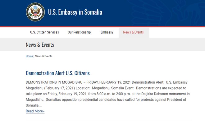 Khamiis, Feberaayo, 18, 2021 (HOL) - Dowladda Maraykanka ayaa muwaadiniinteeda ku sugan gudaha Soomaaliya waxay ugu digtay inay ka fogaadaan banaanbaxyo la filayo inay maalinta berrito ah ka dhacaan magaalada Muqdisho.