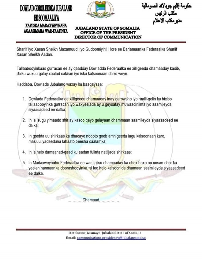 newsinsideWarsaxaafadeed kasoo baxay madaxtooyada Jubbaland ayaa lagu sheegay, in Jubbaland dalbanayso in dowladdu marka hore garowshiyo iyo raalli-galin ka bixiso, waxay ugu yeereen tallaabooyin guracan oo dowladdu u geysatay saamileyda siyaasada iyo muwaadiniinta.